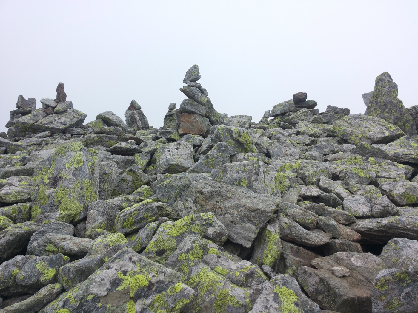 Lasciato il M Berlino ci inoltriamo alla volta del M Grosso seguendo una sorta di sentiero fatto di rocce e piccoli arbusti che una volta in cima ci regala una suggestiva distesa di omini in pietra e un panorama della valle e delle catene montuose circostanti a 360°, Monte Antoroto compreso. Peccato per la nebbia che ci permette solo a tratti di godere del panorama.
