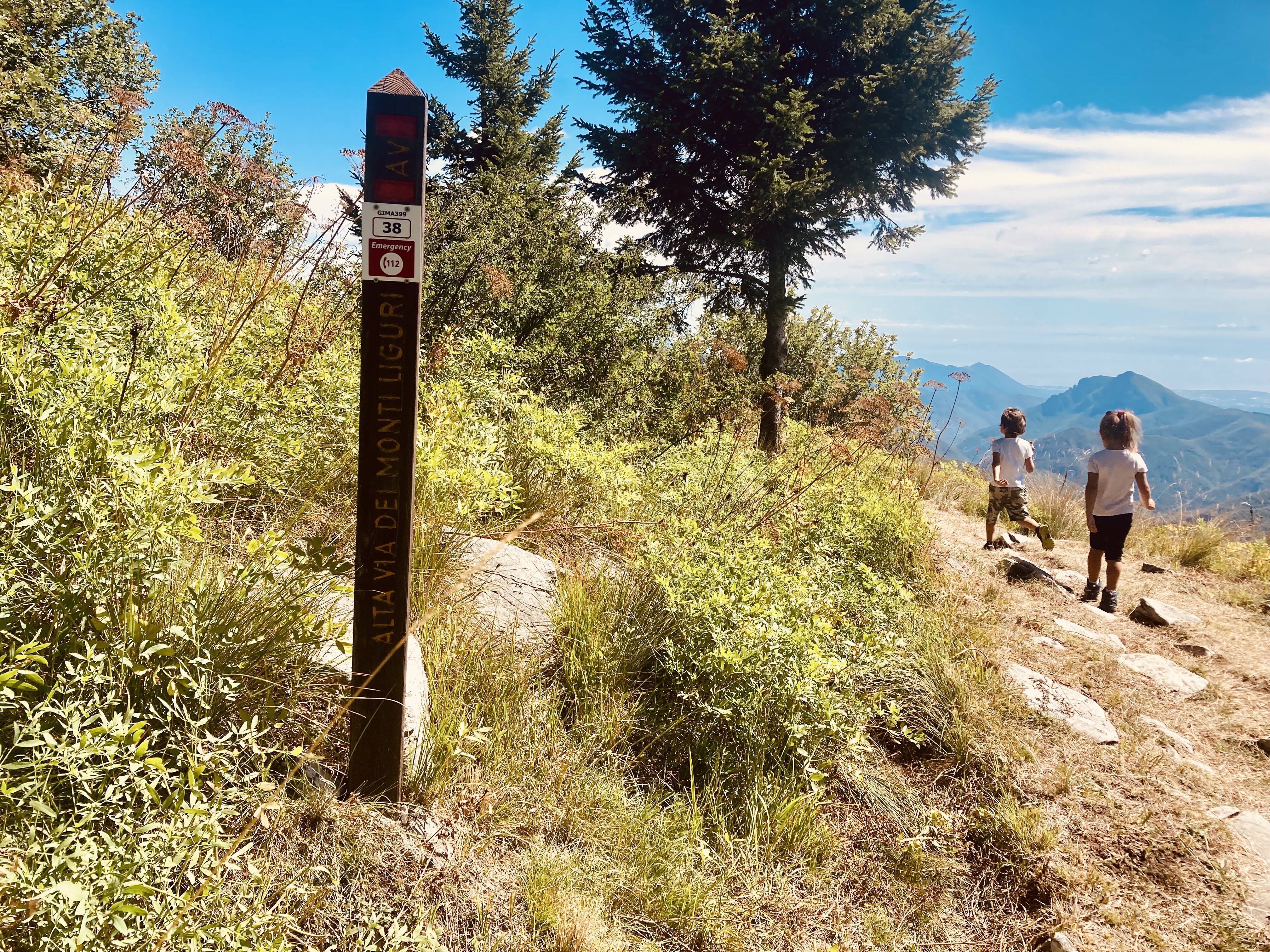 Le tacche bianco/rosse e le indicazioni dell’ Alta Via Monte liguri ci portano verso un ulteriore sentiero in salita nel bosco per poi scendere lentamente attraverso assolati pendii solo punteggiati da bassi arbusti.
