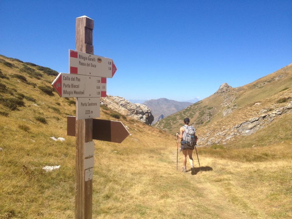 Aggiriamo la conca e procediamo a mezzacosta sino al bivio per il lago delle Moie (dalla quale paseremo al ritorno percorrendo un anello) e procediamo lungo il sentiero in salita sino ad raggiungere una gola. Superato il pratone, sede probabilmente in tempi passati di un altro laghetto troviamo un segnavia con l’indicazione verso destra per Porta Sestrera (segnavia G6) e imbocchiami quindi il sentiero (segnavia G6) che sale deciso su pendii prativi.