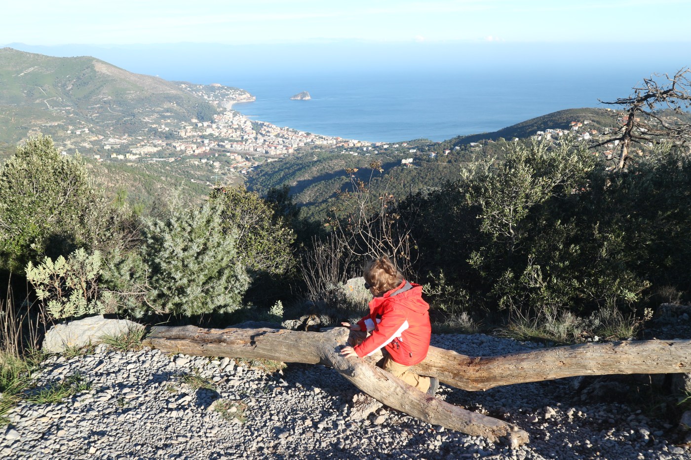Arrivati al Bric, la sosta è dovuta. Siamo fortunati, pur essendo novembre inoltrato, il sole ci scalda la pelle e ci permette di fare un picnic con vista Noli e Bergeggi con la riconoscibile isola di Sant’Eugenio e giù lungo la costa di Genova.