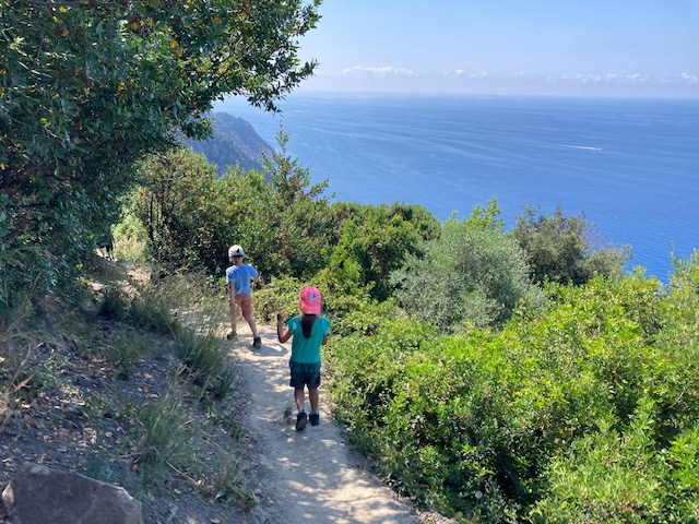 Si sale e si sale e si sale ma è bellissimo fermarsi per ammirare la baia di Levanto vista dall’alto, il mare è tutta una sfumatura di blu.