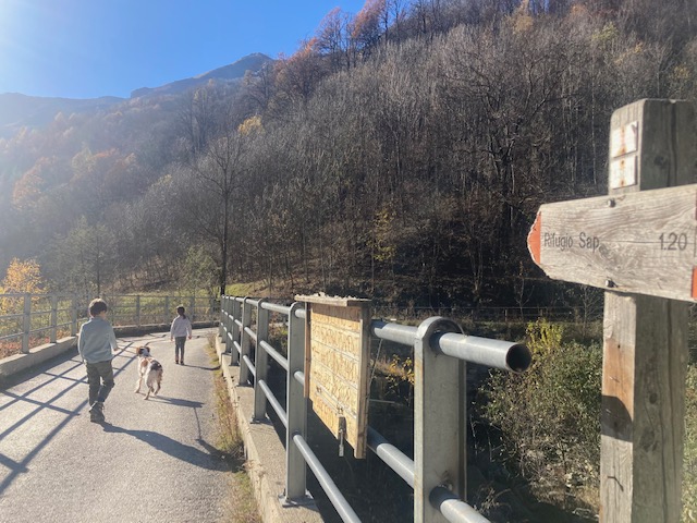 Impostando sul navigatore “Loc. Pradeltorno – Angrogna“.e raggiunta la destinazione, parcheggiamo l’auto vicino al ponte sul torrente Angrogna, superiamo quest’ultimo e seguiamo le indicazioni per il rifugio.