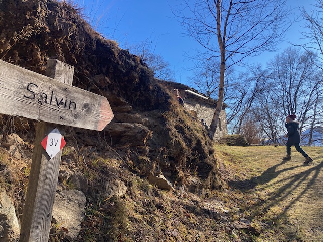 Procediamo con il nostro itinerario, percorrendo dal piazzale, la strada in salita per una cinquantina di metri, prima di raggiungere il bivio per la borgata Salvin e l’omonimo rifugio.