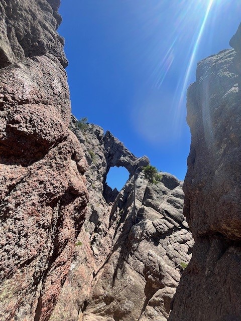 Il Trou de la Bombe è una cavità circolare di circa 8 metri di diametro, scavata nella roccia granitica dal fenomeno dell’erosione naturale, noto come tafoni. Questa erosione è causata dall’azione combinata di vento, pioggia e variazioni termiche, che nel tempo hanno modellato la roccia, creando formazioni uniche come questa. Il risultato è un arco naturale che sembra quasi scolpito dall’uomo, ma che è frutto esclusivamente delle forze della natura.