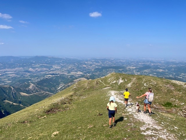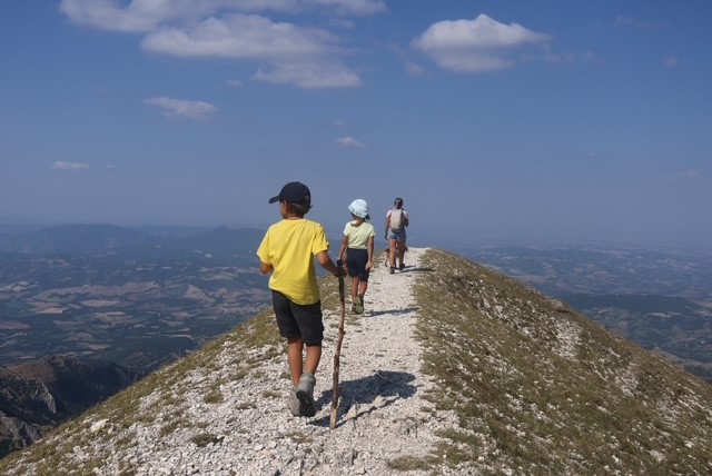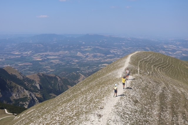 Raggiunta la vetta del Monte Catria, il panorama ripaga la fatica: un panorama a 360° che spazia dal Monte Nerone, al Monte Cucco, i Monti Sibillini e, verso est, l’Adriatico.