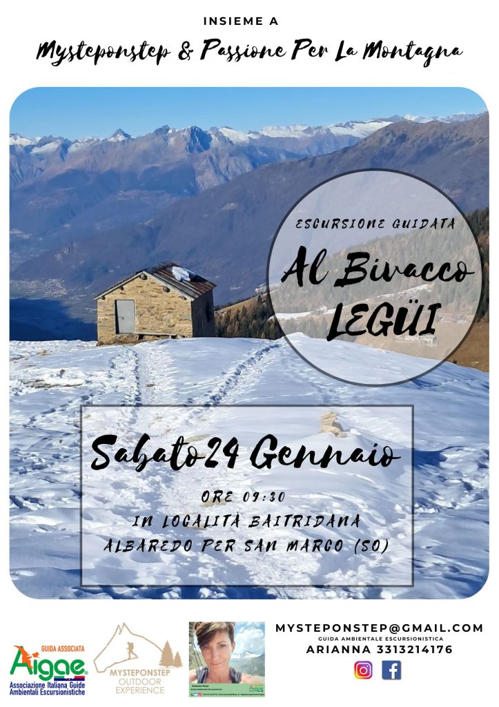 Partiremo da Baitridana, sulla strada del Passo San Marco, seguendo un sentiero panoramico che sale dolcemente tra pascoli e alpeggi, con ampie vedute sulle cime circostanti. Il percorso ci condurrà fino al Bivacco Legüi, balcone naturale affacciato sulle montagne valtellinesi, luogo perfetto per una pausa rigenerante e qualche scatto ricordo.
